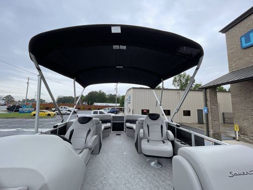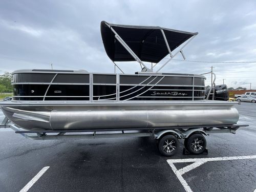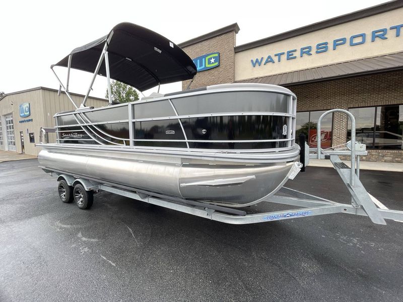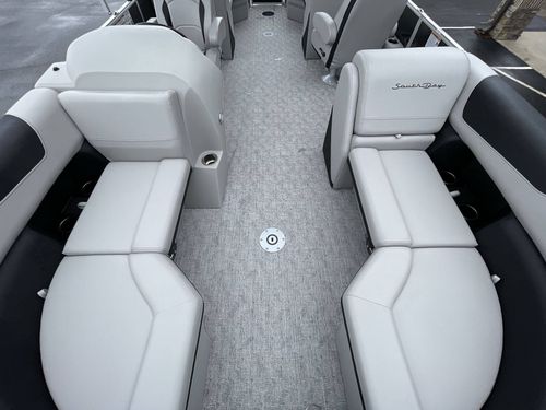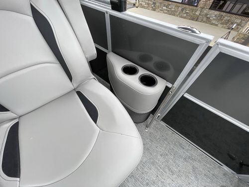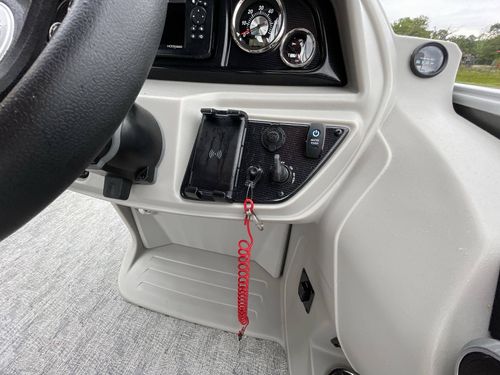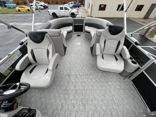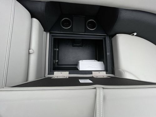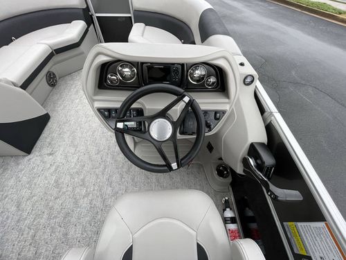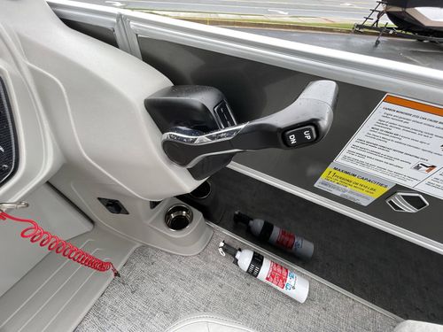 This boat is fitted with a powerful SUZUKI engine powering an iconic tri-toon design. Notable features include a center sport tube, aluminum underdeck, and large lifting strakes on the inside of the outer tubes. The boat is fitted with a robust 27-gallon fuel tank and boasts state-of-the-art Seastar hydraulic steering and tilt steering for maximum control and precision on the water.