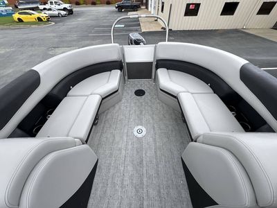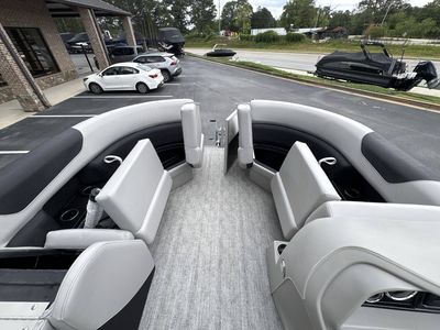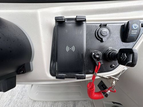 Bimini Top and Mooring Cover: It features a Power Electric Bimini Top and a strong Mooring Cover, both warped in a chic Black Canvas Color for optimum protection and comfort.