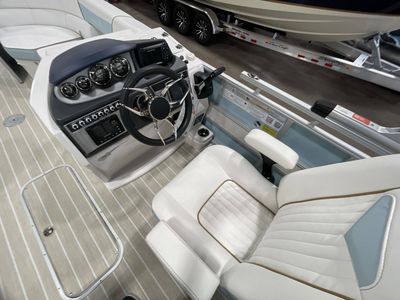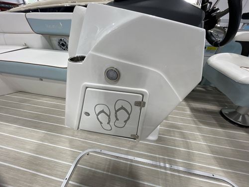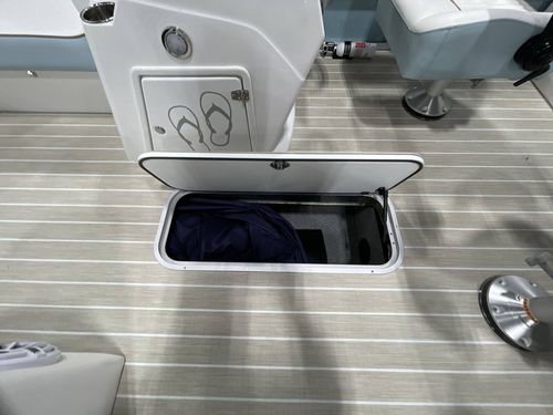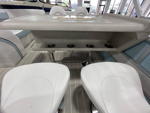 Storage space in this model is abundant, structured with an in-floor storage area measuring a spacious 24"W 79"L. The accompaniment of beach wood teak flooring adds a luxurious touch to its interiors. It also comes with a Power Electric Bimini Top Standard and a mooring cover, providing sophisticated protection against weather elements.