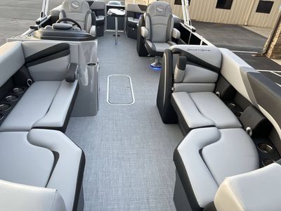 For additional storage, the boat has spacious In-Floor Storage measuring 24"W 79"L. The flooring is a stylish Titanium Standard.