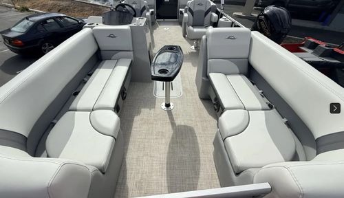 - High-Quality Build & Attention to Detail: • Roto-molded furniture with rain-drain channels under cushions (keeps everything dry & clean) • Wrap-around lounges with under-seat storage—plenty of room for gear, coolers, toys, towels • Heavy-duty logs (23″×25″ “Jumbo” performance logs) with closed-cell flotation foam—solid flotation and stable ride • Wide-body design (8’6″ beam), premium deck & structural support (deck extrusions, through-bolts)—built for durability & smooth water time. • Comfort & convenience: Tilt steering, power assist hydraulic steering in higher trims, deluxe lounge layouts, built-in cooler under the bow corner, mood & courtesy lighting, full boarding ladder.