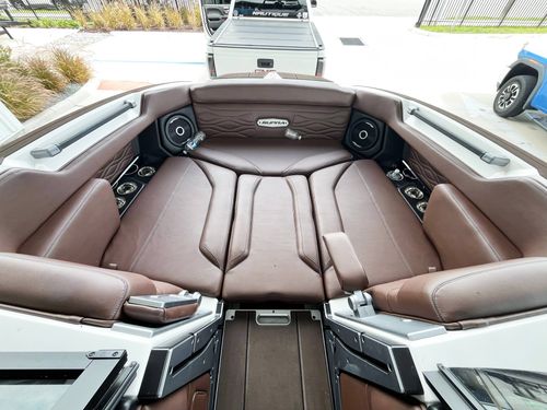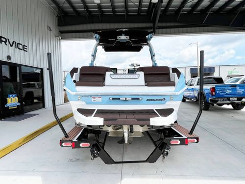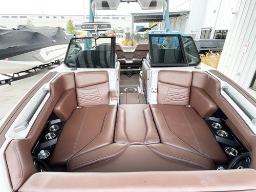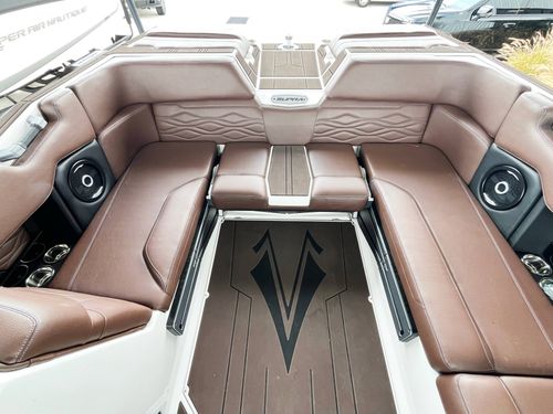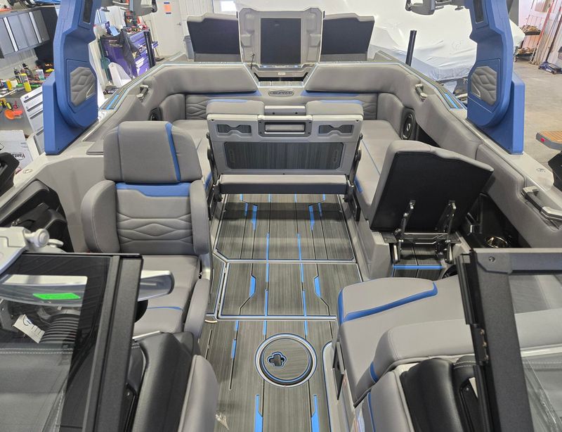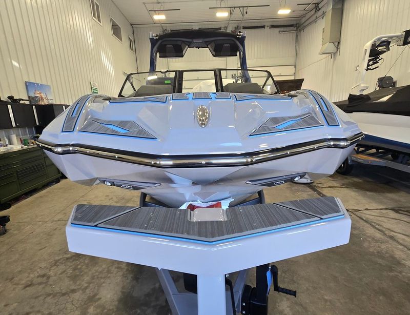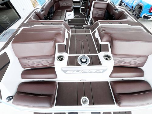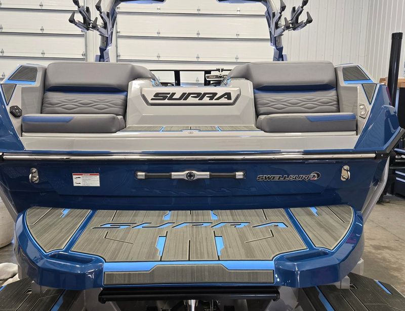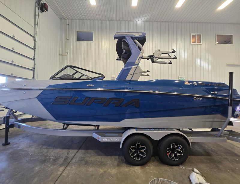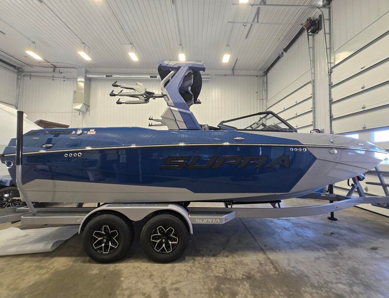 2025 Supra SA450 with only 35 hours of use. Powered by the Raptor 450 Ford 6.2L by Indmar. with CNC prop and electric power assist steering, this boat is loaded with premium options including dual stern thrusters, driver and observer seat cooling upgrade, underwater transom RGB lights, tower docking lights, power folding Bimini, ClampForce board racks, two pairs of white tower speakers with 8-channel amp, audio remote at transom, PTMEdge VR-140X mirror, interior wash down system, integrated inflatables airstation, and 3-tube heater. Finished in Slate Blue and Pure White with Walnut Fresco “Chill Tech” interior and stainless steel rubrail.