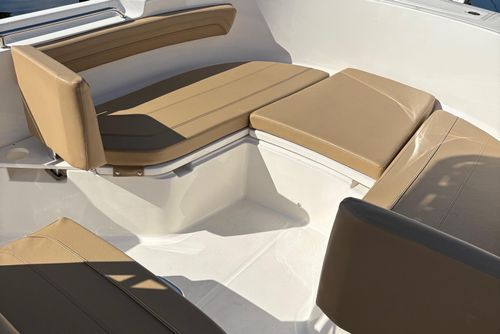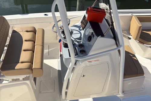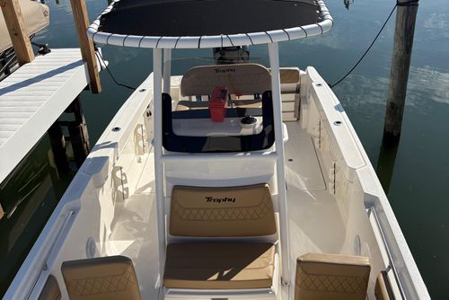 The Trophy T24CC is a rugged, family-friendly center console boat built for both serious angling and relaxed coastal cruising. Riding on a deep-V hull, it offers a stable, confident experience in varied conditions while accommodating up to 12 passengers. Standard features include a self-bailing cockpit, canvas T-top with rod holders, trim tabs, dual insulated fish boxes, and a 15-gallon baitwell—making it ideal for inshore and offshore fishing. With expanded fuel capacity, ample storage, and thoughtful comfort upgrades, the T24CC blends fishability with versatility for all-day adventures