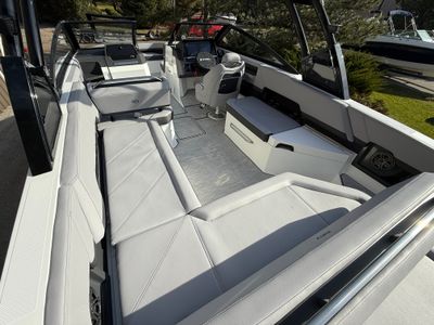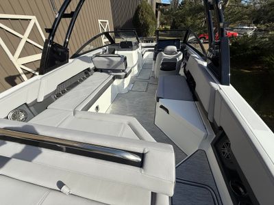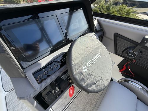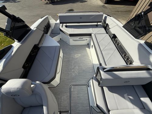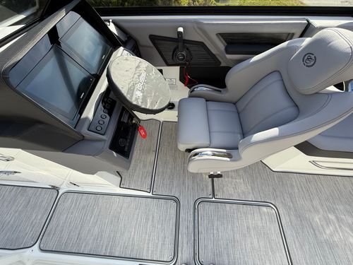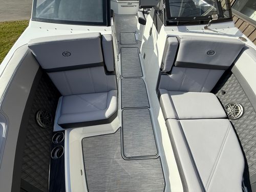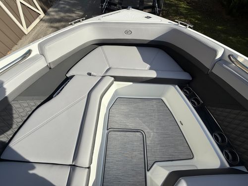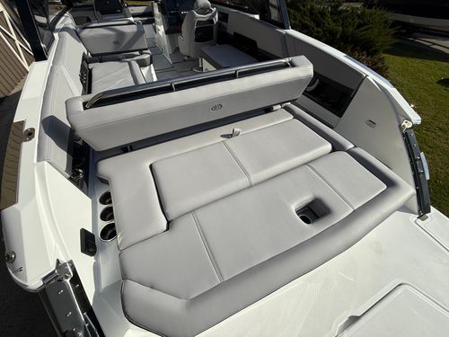 At the helm, the dual Garmin 8610 glass cockpit provides a cutting-edge command center with crystal-clear displays and intuitive controls. Keep your devices powered with the wireless phone charger, and enjoy rich audio from the Premium Sound system with transom speakers—perfect for boat days at anchor or a quiet cruise at dusk.