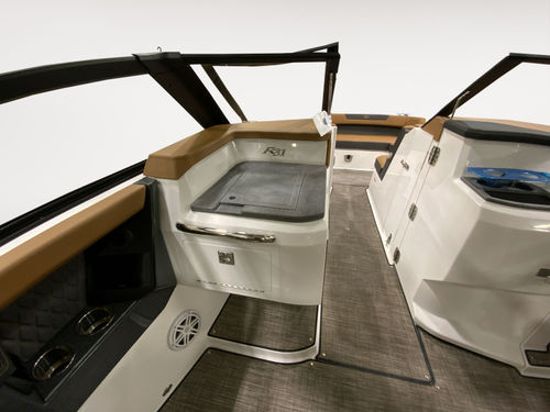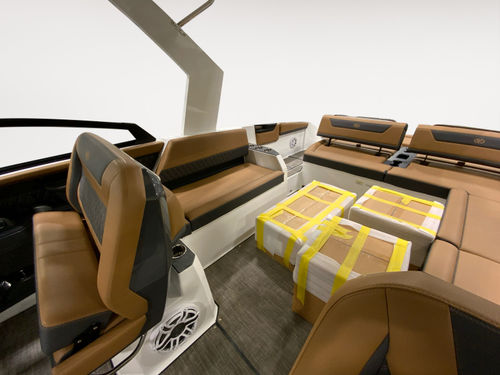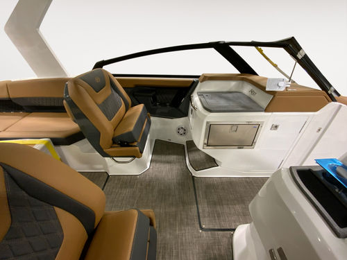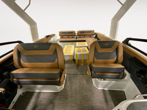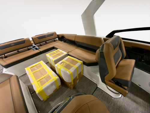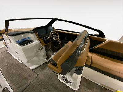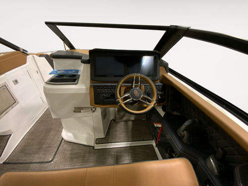 The helm features dual 12-inch Garmin glass cockpit displays for a clean, intuitive command center. A leather color-matched steering wheel, fold-down footrest, & passenger helm watch seat ensure captain & co-pilot ride in comfort. A rear-facing camera adds confidence when docking or monitoring activity at the swim platform.