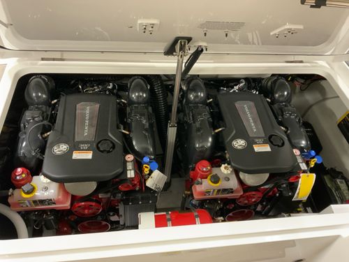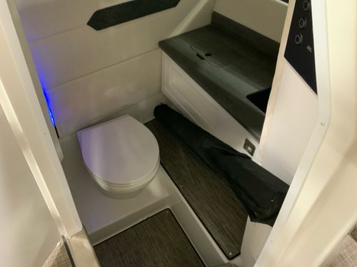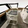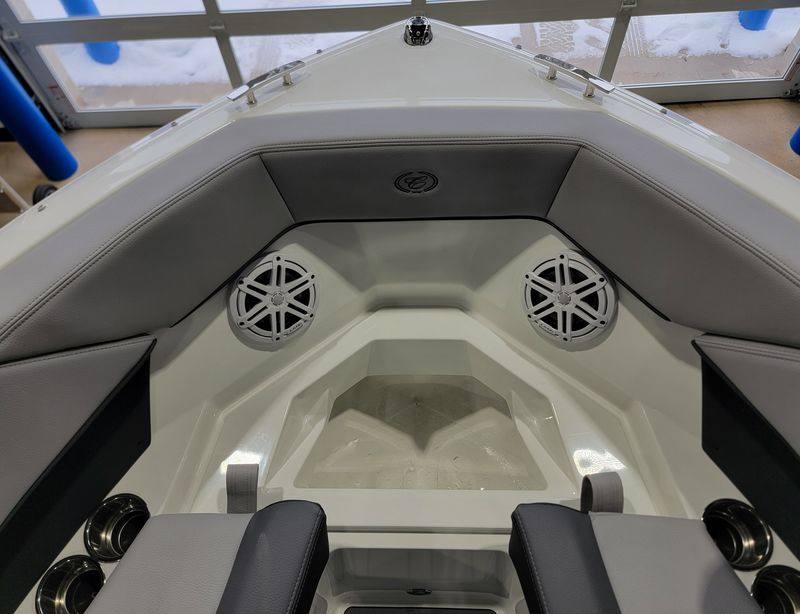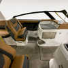 Step aboard to a rich Caramel/Carbon interior accented by a wood trim package & solid teak dinette table. Sea grass flooring flows throughout the bow, cockpit, helm, and head, delivering durability with upscale appeal. Weighted throw pillows & RGB LED accent lighting under the hardtop create the perfect atmosphere for both relaxed cruising & evening entertaining.