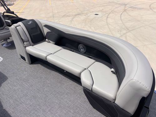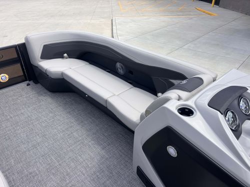 This stunning boat features an exciting Railskin Color in Bohemian Blue with an Accent Gray Moonstone Railskin Packages: Blackout Package, and Cabrio Furniture: Marquesan Gray with Onyx Flooring in Amore Gray.