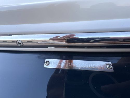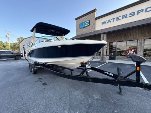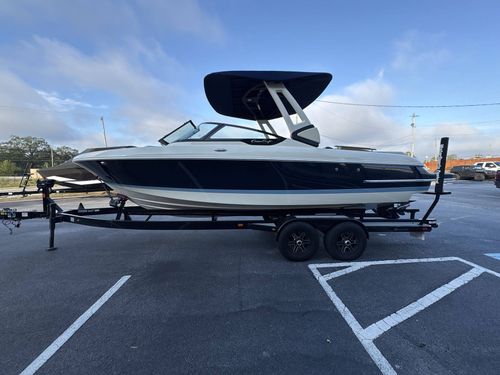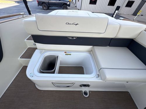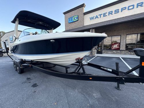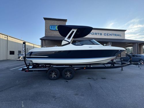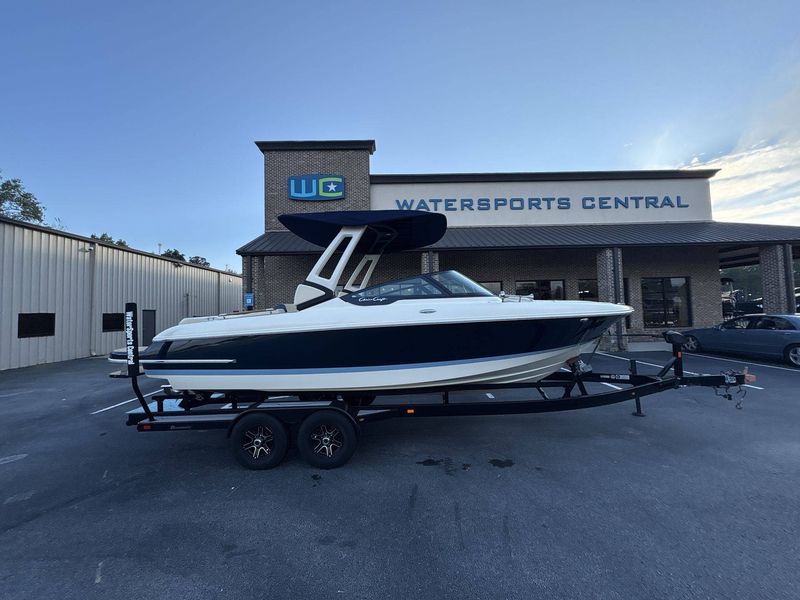 Additional Features: The boat comes equipped with an automatic fire extinguisher, LED Bow Docking Lights, a comfortable cockpit filler cushion, and a protective cover in Navy.