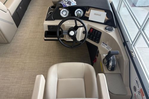 The helm is equipped with modern marine technology including Bluetooth audio system, Lowrance GPS/fishfinder, digital gauges, and USB/12V charging ports, giving the captain full control and connectivity on the water. Additional premium features include power Bimini top, ski tow bar, stainless steel hardware, LED courtesy lighting, recessed cup holders, and marine-grade flooring for durability and style.