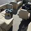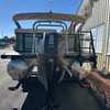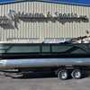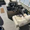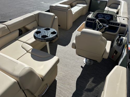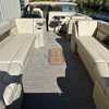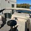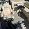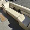 This pontoon boat promises superior comfort with its plush seating and modern amenities. The seats are elegantly upholstered, providing a comfortable area to relax and soak in the surroundings. It also includes a state-of-the-art audio system for entertainment, a table for alfresco dining, and a bimini top for shade on sunny days.