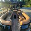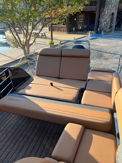 The interior of the 2026 Harris 230 Grand Mariner matches its alluring exterior with comfort features and amenities for up to 14 guests. It includes plush, hand-stitched upholstery, a convenient mid-ship walk-through, a generous sun lounge, and an inviting bow seating area.