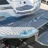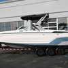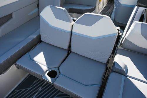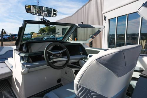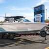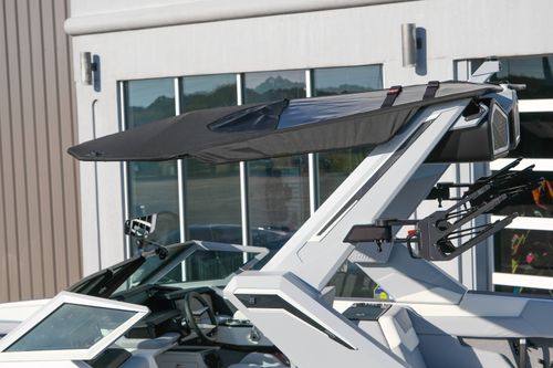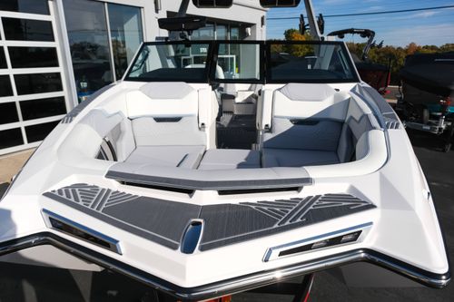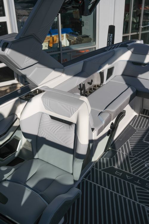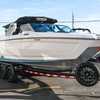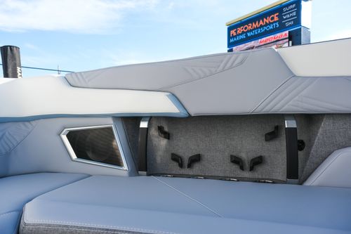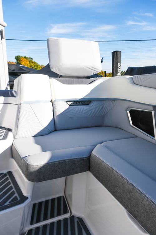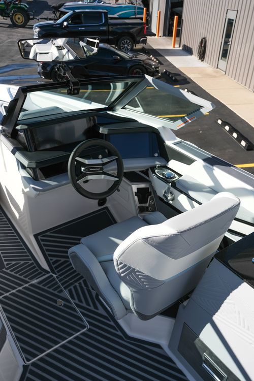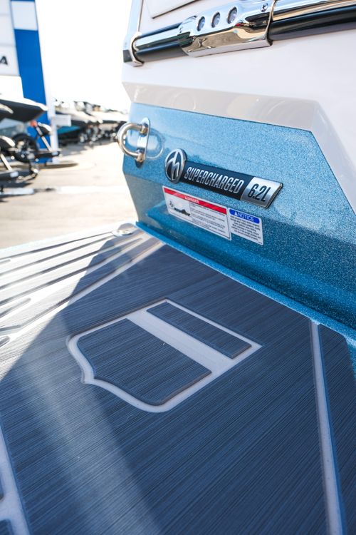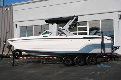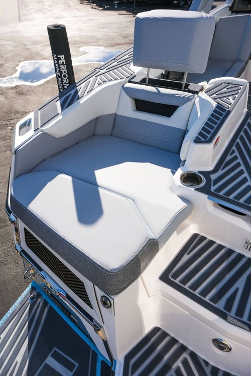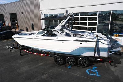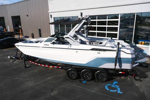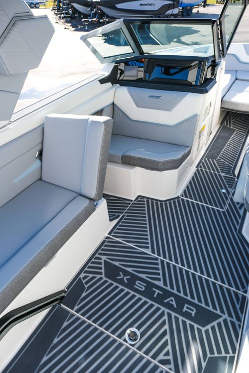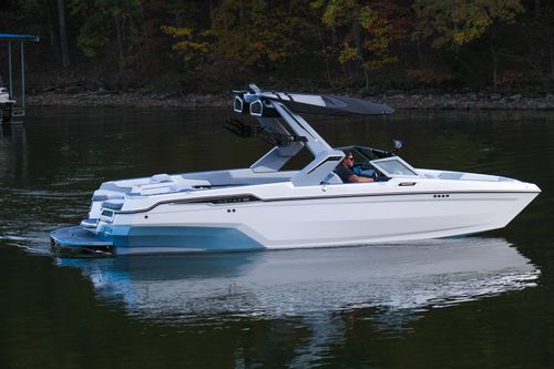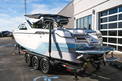 The 2026 MasterCraft XStar 25 represents the pinnacle of luxury, performance, and innovation in the world of wake boats. Finished in White with COASTAL BLUE Flake and accented by SILVER Satin badging, this build makes a bold statement both on and off the water. Inside, the CoolFeel STEALTH GREY interior with Heathered Charcoal trim and detailed stitching creates a refined, upscale atmosphere for every passenger. Powered by the Ilmor 6.2L GDI VD 2.1 Supercharged engine, this XStar S25 delivers relentless performance with precision handling, enhanced by hydraulic steering, tracking fins, and a proportional stern thruster for effortless maneuverability. SurfStar technology with FastFill ballast ensures an unrivaled surf experience with customizable waves at the touch of a button. The Z100 tower features a premium bimini in white, clamping XL board racks, and a full tower audio package with sound pods, all controlled through the dual-screen Command Center with mAX. Comfort amenities include heated helm and observer seats, a refrigerator, Murphy seat, bow filler cushion, heater, and transom lounge seating—making every outing a premium experience. Additional highlights include RGB accent lighting, underwater lighting, docking lights, stainless fender clips, panoramic XStar mirror, and aft/transom shade systems. A triple-axle trailer in Midnight Black with XD820 Black Machined wheels ensures secure transport in style. This XStar25 is the ultimate combination of performance, luxury, and design—crafted for those who demand the very best.