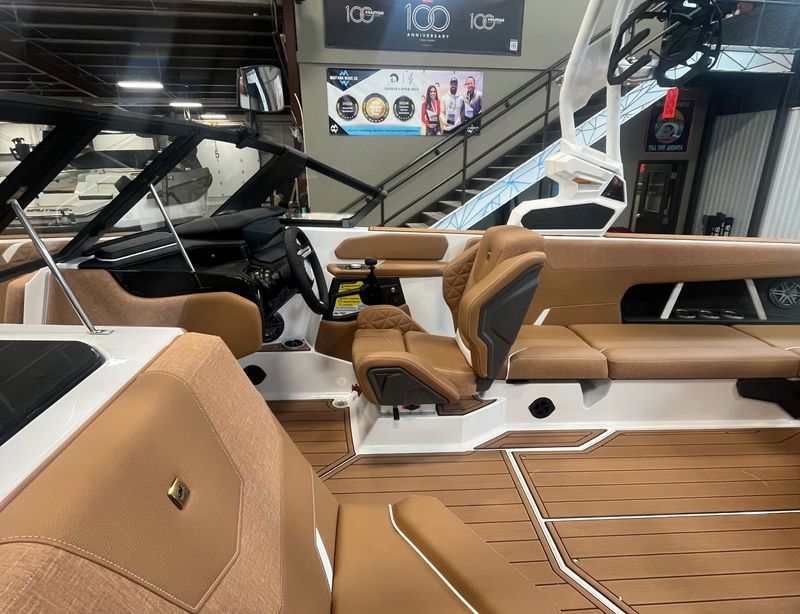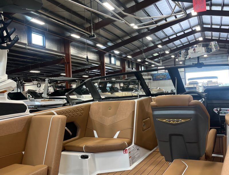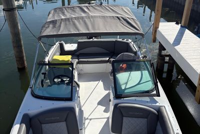 Whether serving up a family beach party or facing down gnarly weather conditions, the 223 DC responds ably to any captain’s command. Its rugged Deep-Vee hull and U-shaped wraparound cockpit ensure a comfortable ride for everyone. A panoramic walk-through windshield, enclosed dressing room, leather touch upholstery and Fusion stereo system are just a few of its creature comforts. A Seadek transom landing and forward and aft boarding ladders extend the fun beyond the boat. Whatever the circumstances, the 223 answers your call to the water.