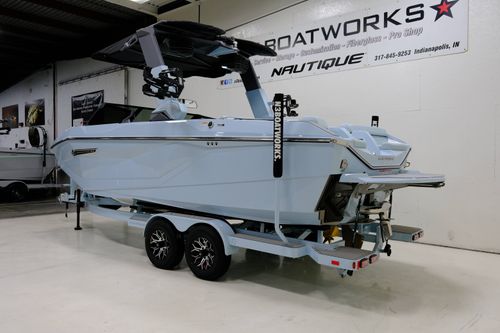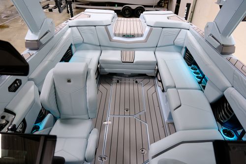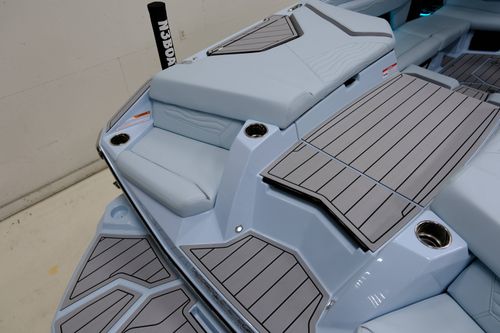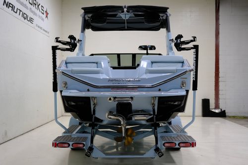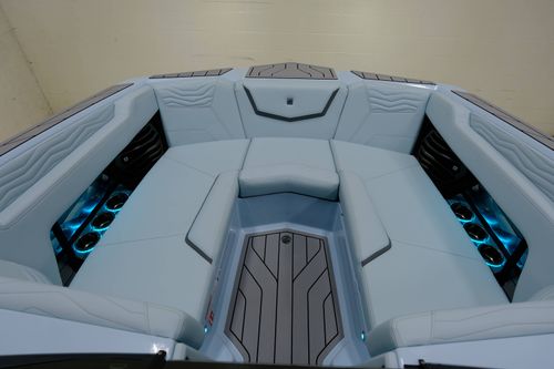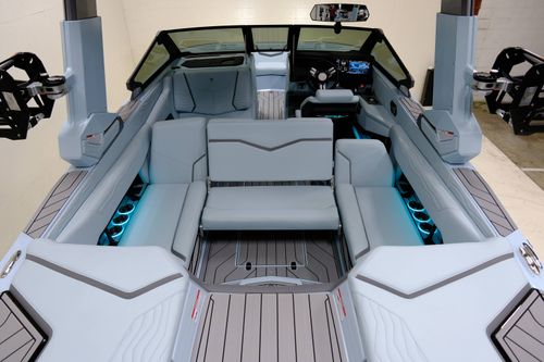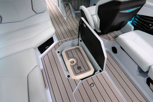 Standard Features: Nautique Configurable Running Surface with Hydro-Plate, Stereo - JL Audio® M6 Series Elite with DSP (Stereo, 6 Speakers, 10" Subwoofer, 8 Channel Amplifier), Nautique LINC PANORAY with Helm Control, Power Management Access with Dual AGM Batteries, Zero Off GPS Speed Control, Lighting - Docking Light, Array; LED Courtesy Lights, Nautique Surf System™ with WAVEPLATE & Surf Pipe Exhaust, Cleats (4); Removable Cooler; Waste Receptacle, Premium Mirror, Wake Package (Integrated Ballast 2,400 lbs), Sliding Reversible Stern Seat and Flip-Up Lounge Seat (Port), Transom Seating, Flight Control Tower with Nautique Awareness Camera, GoPro Ready Rotating Tow Point, Freshwater Engine Flush System, MyNautique Connectivity Platform, Rotating Wakeboard/Wakesurf Racks, Wireless Charging, Helm Command w/ Wireless Charger, Premium Mirror, ZZ6 450HP - 6.2L Direct Injection