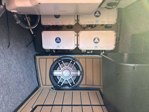 The boat is fitted with a Telescoping Flight Control Tower System for maximum functionality and safety, and comes prepped with JL Audio M Series Studio (Pre-Wired 8 Channel Amp).