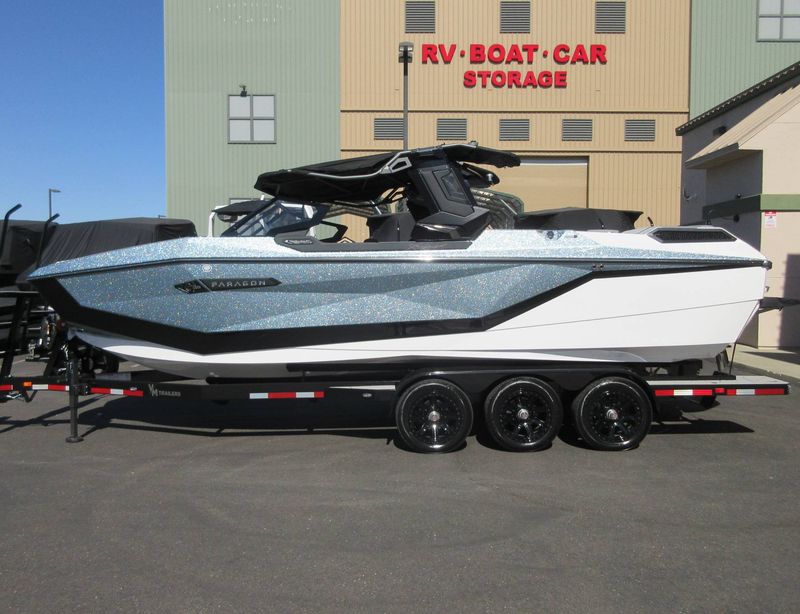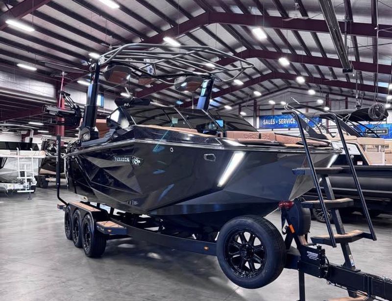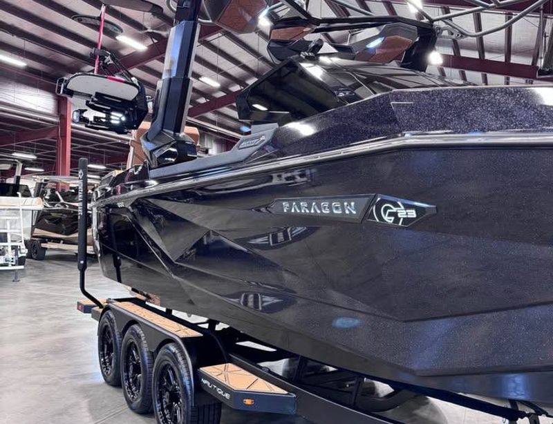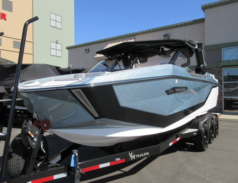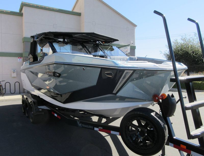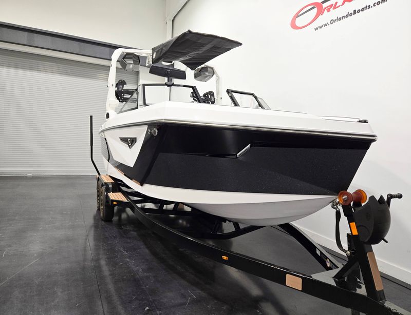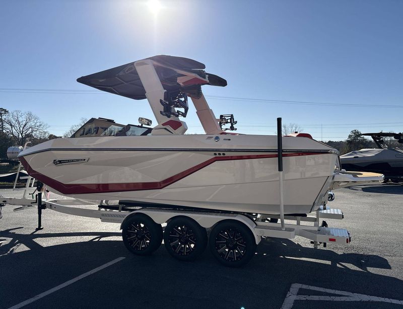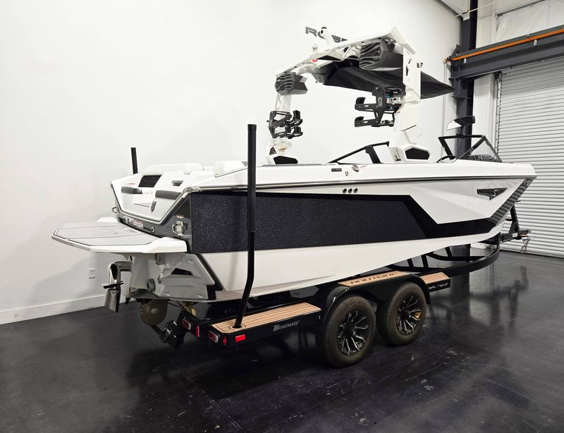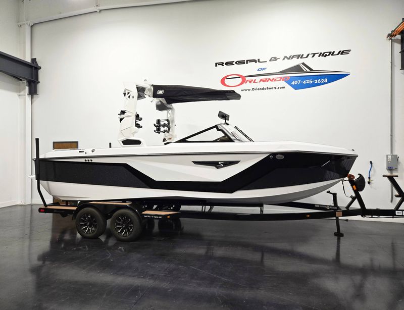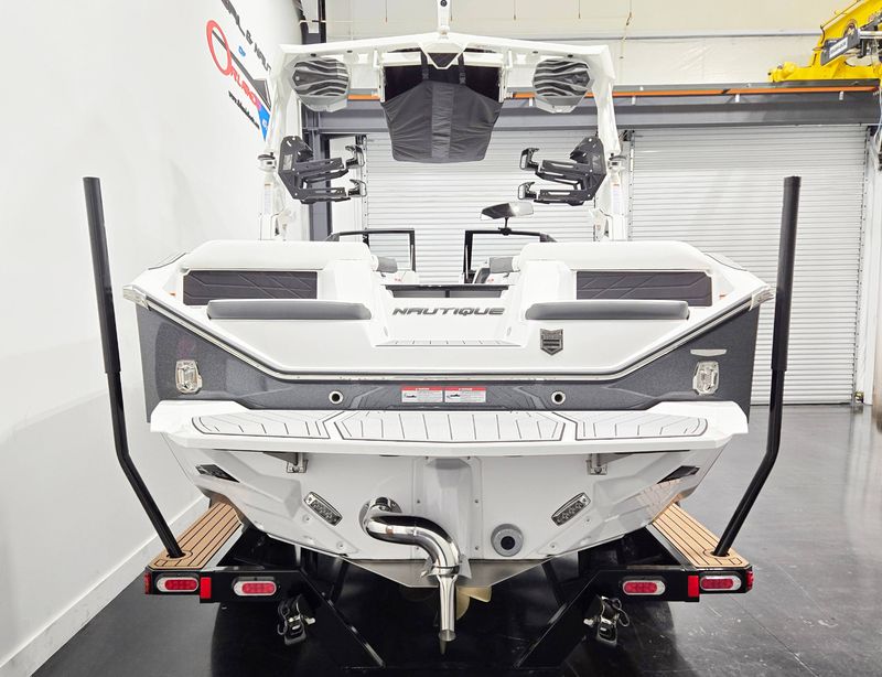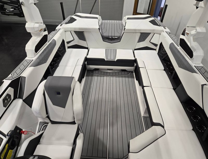 STANDARD FEATURES: Nautique Configurable Running Surface, Nautique LINC Panoray with Helm Control, Zero Off GPS Speed Control, Flight Control Tower w/ Rotating Board Racks, Nautique Surf System with WAVEPLATE & Surf Pipe Exhaust, Freshwater Engine Flush System, Wake Package(Ballast 1700lbs), Centennial Package (Chromax, Steering Wheel, Glovebox, Non-Skid), Stereo JL Audio M3 Serries (Stereo, 2 Channel Amp, 4 M3 Speakers), LED Courtesy Lighting, Cleats (4), Removable Cooler, Waste Receptacle, MyNautique Connectivity Platform, Premium Mirror.