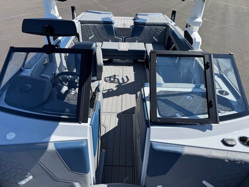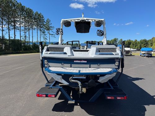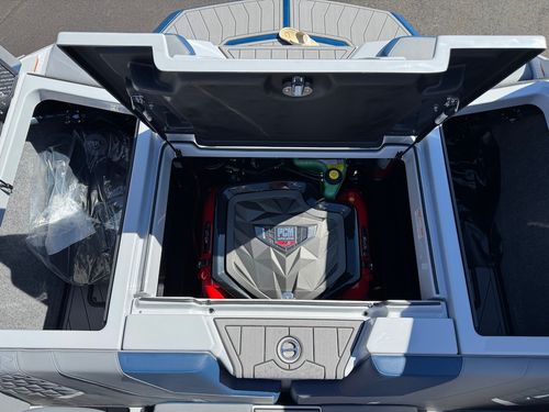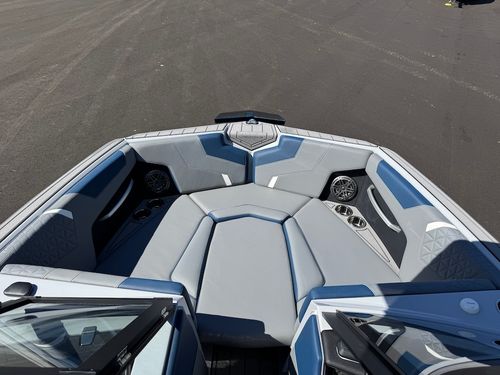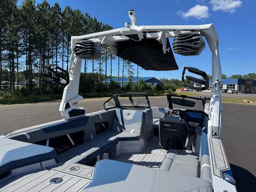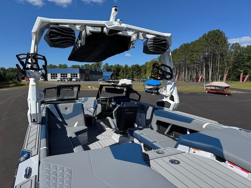 2026 Nautique GS22 – This 22′ crossover is powered by a PCM ZZ5 355hp 5.3L direct-injection engine, providing strong, reliable performance for wakesurfing, wakeboarding, or skiing. The Nautique Surf System with Waveplate and Surf Pipe Exhaust delivers clean, customizable waves, while the Flight Control Tower with JL Audio M6 tower speakers and Bimini with surf pockets adds both function and style. Inside, you’ll find heated driver and loveseat seats, a sliding reversible stern seat, walk-thru air-dam, wireless charging, and a JL Audio M3 Premier stereo with XM satellite radio. Supplemental ballast, docking/daytime running lights, and a retractable ski pylon make this GS22 ready for any water activity. Finished in Admiral Blue Metal Flake with Jet Black and Haze Grey Trueweave accents, the GS22 blends performance, luxury, and versatility for the ultimate all-around watersports experience. Call or visit us today to make it yours!
