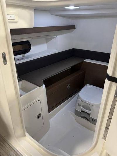 - This private space includes a portable head, a vanity with a sink, and storage for toiletries, ensuring you have everything you need while on board. The compartment is thoughtfully designed with non-slip flooring and ample headroom, providing a comfortable and functional area for all your needs.