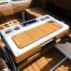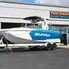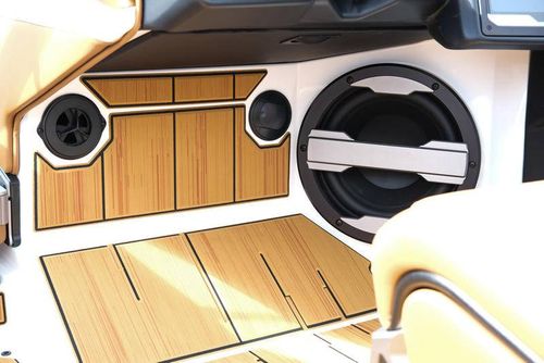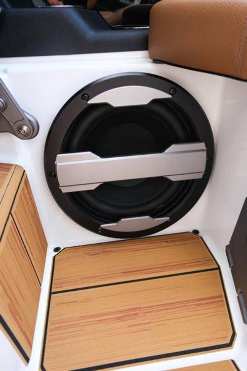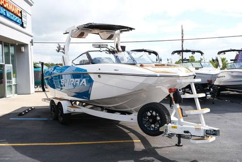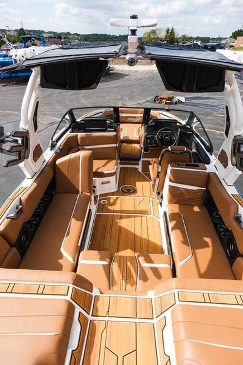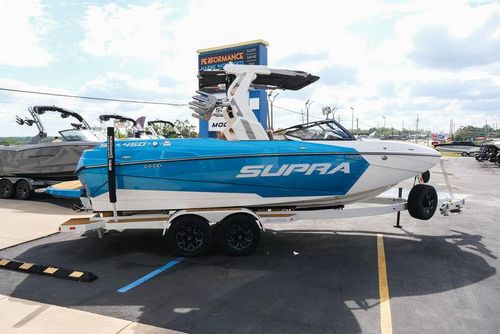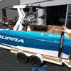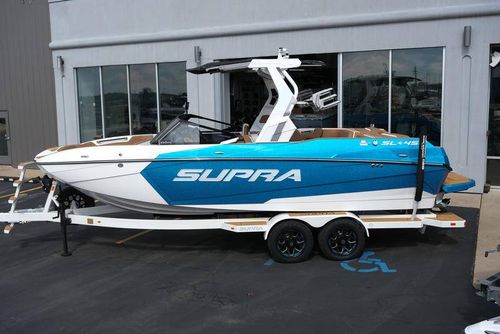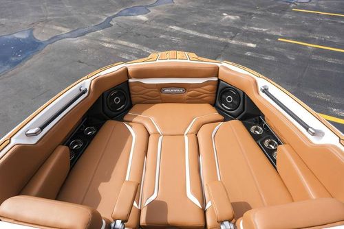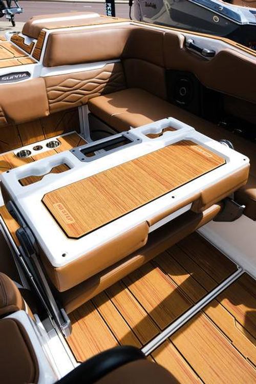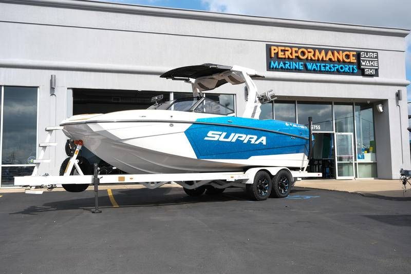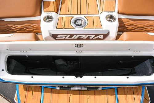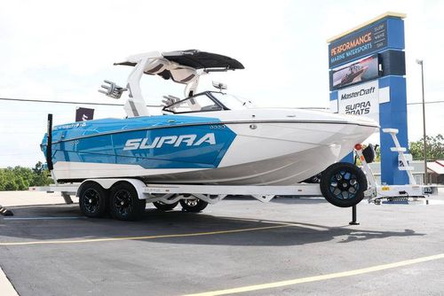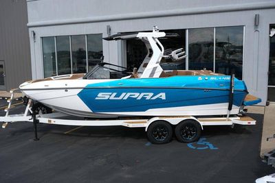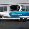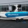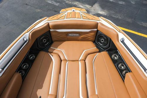 This 2026 Supra SL pairs Pure White hull lines with Ultra Blue Metal Flake main panels for a crisp, modern look, then layers in Pecan Fresco “Chill Tech” upholstery with White accents and Pacific Blue stitch to carry the color story inside. The big power move is the Ford Raptor 450 by Indmar, backed by Electric Power Assist Steering and Dual Stern Thrusters for precise dockside control. Surf sessions stay shaded with the Power-Folding Bimini, while ClampForce board racks and VA4 vertical-array tower speakers keep the crew organized and the vibe loud. A Drop-Step swim platform, heater, integrated inflatables airstation, and electric 25L cooler round out long-day comfort. Quad-beam RGB midship lights plus RGB transom lights add the glow; Phender Pro, stainless rubrail, and a full cover kit keep it looking new. Finished with Toffee/Black/Toffee laser-cut nonskid and white tower (main + accent) for a sharp, factory-fresh stance.