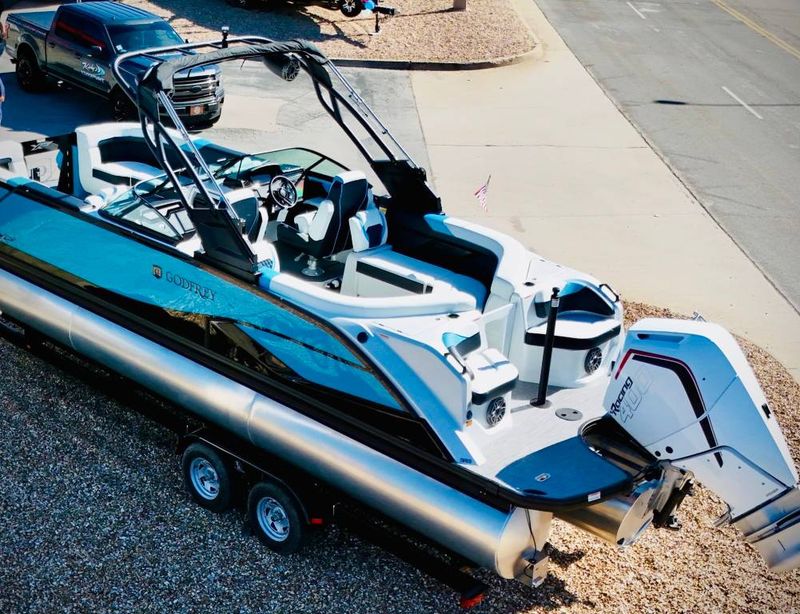 Godfrey pontoons are known for their luxurious designs and thoughtful features. Models often include spacious seating, ergonomic layouts, and amenities like built-in coolers, integrated storage, and LED lighting. Advanced helm technology and premium sound systems enhance the overall on-water experience.